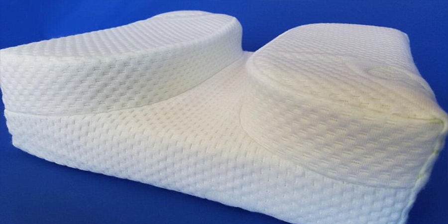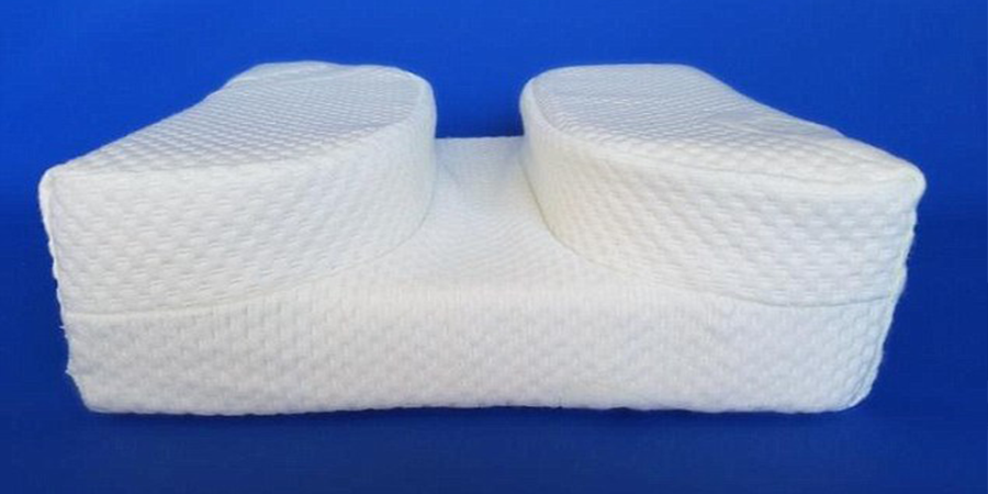 It has a hollow tunnel on one side so glasses won’t be pressed up against the face uncomfortably whe wearer lays on his or her side. The pillow features a cushion that is square on one side and split in two on the other, with a hollow tunnel running one side to the other. Person lays down on the slit side with both the top and btom parts of her supported the pillow and the glasses fitting in between.